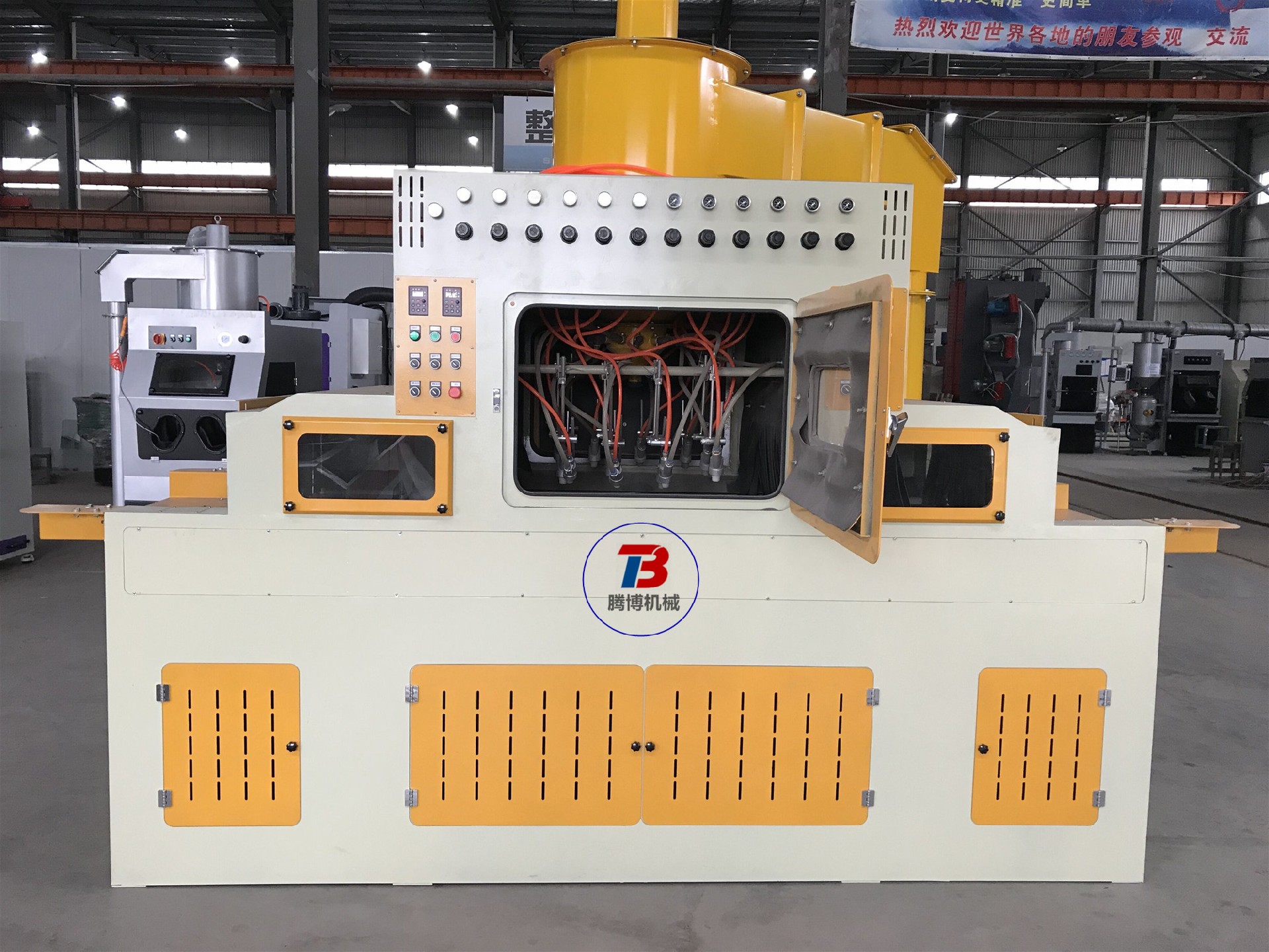 E 采用多槍噴砂,噴砂角度可任意調(diào)節(jié);操作時,僅需將工件置于輸送帶上,即可進行自動噴砂加工,操作十分簡單方便 .